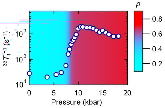 Pressure dependence of the 35Cl-NQR spin–lattice relaxation rate 35T1−1 at ambient temperature. The color represents the degree of charge transfer ρ and corresponds to the color in Figure 5f. Reprinted with permission from []. Copyright 2018, American Physical Society.