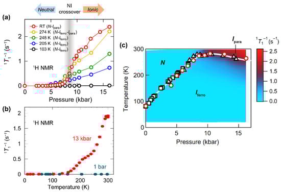 First, we performed NMR experiments for 1H sites in TTF molecules. Figure 8a shows the pressure profiles of the 1H-NMR spin–lattice relaxation rate 1T1−1, probing electron spin fluctuations, at fixed temperatures. At 103 K, where the system shows the N-to-Iferro transition with increasing pressure, 1T1−1 is vanishingly small throughout the N and Iferro phases, indicative of nonmagnetic states, which accords with previous 1H-NMR results [,] and is reasonable because of the closed-shell structure for the N phase and spin-singlet pairing for the Iferro phase. Remarkably, at higher temperatures, the 1T1−1 values are enhanced only in the pressure region above the NI crossover. Consistent behaviors are seen in the temperature dependence of 1T1−1 at ambient pressure (the N-to-Iferro transition) and 13 kbar (the Ipara-to-Iferro transition), as shown in Figure 8b; 1T1−1 at ambient pressure is vanishingly small over the whole temperature range below 300 K, whereas 1T1−1 at 13 kbar takes large values near room temperature in the Ipara phase and is drastically suppressed upon entering the Iferro phase. Note that 1T1−1 below Tc at 13 kbar adopts a shoulder structure around 200 K; however, the 13C-NMR relaxation rate, 13T1−1, exhibits no such clear shoulder, although there is a sign of it, as shown later. Although the origin of the different behaviors is not clear, the non-monotonous temperature dependence of the relaxation rate is possibly because two types of spin excitations, such as the spin-triplet and the polaron, are responsible for T1−1 in the Iferro phase, as described in Section 4.3; just below Tc, the former, with higher excitation energy, is drastically suppressed upon cooling and almost vanishes around 200 K, whereas the latter, with lower excitation energy, gradually decreases and survives at a lower temperature. The detailed temperature profile of spin excitations upon the Ipara-to-Iferro transition is discussed in Section 4.3. The contour plot of 1T1−1 depicted on the P-T plane using these data clearly illustrates that the Ipara phase is the hot spot of activated spins (see Figure 8c). The kink temperatures of 1T1−1 well coincide with Tc determined by the NQR measurements described in Section 3.2.