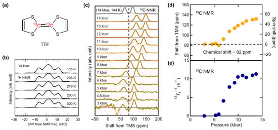 (a) 13C-enriched TTF molecule, in which the central double-bonded carbon atoms are substituted by 13C isotopes with a 99% concentration. (b) Temperature profile of 1H-NMR spectra at 13 kbar. (c) 13C-NMR spectra measured at 285 K under various pressures. The gray spectrum was measured at 14 kbar and 144 K in the ionic ferroelectric phase. The origin of the shift corresponds to the resonance frequency of tetramethylsilane (TMS). Pressure profiles of the 13C-NMR spectral shift (d) and spin–lattice relaxation rate 13T1−1 (e) at 285 K. Reprinted with permission from []. Copyright 2018, The Authors, some rights reserved; exclusive licensee AAAS. Distributed under a CC BY-NC 4.0 License (http://creativecommons.org/licenses/by-nc/4.0/ (accessed on 30 November 2021)).