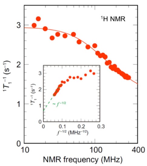 Frequency dependence of 1H-NMR spin–lattice relaxation rate 1T1−1 at 300 K in the ionic paraelectric phase at 14 kbar. Red line is a fit to the data (see text and [] for details). The inset is a plot of 1T1−1 against f−1/2. Reprinted with permission from []. Copyright 2018, The Authors, some rights reserved; exclusive licensee AAAS. Distributed under a CC BY-NC 4.0 License (http://creativecommons.org/licenses/by-nc/4.0/ (accessed on 30 November 2021)).