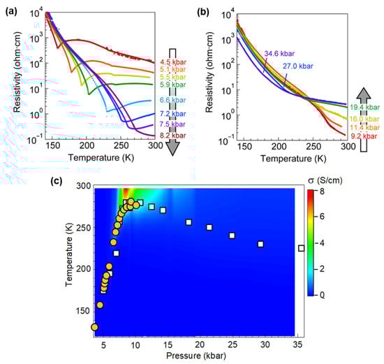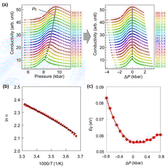(a) Electrical conductivity under finely tuned pressures at fixed temperatures (left panel). Plot of conductivity against ΔP = P − Pc (right panel). Pc is determined by the peak pressure of conductivity at a given temperature. (b) Activation plot of conductivity at ΔP = 0. Black line is a fit of the single-exponential function to conductivity. (c) Activation energy, Eg, evaluated at various ΔP. Reprinted with permission from []. Copyright 2019, The Authors, some rights reserved; exclusive licensee AAAS. Distributed under a CC BY-NC 4.0 License (http://creativecommons.org/licenses/by-nc/4.0/ (accessed on 15 November 2021)).