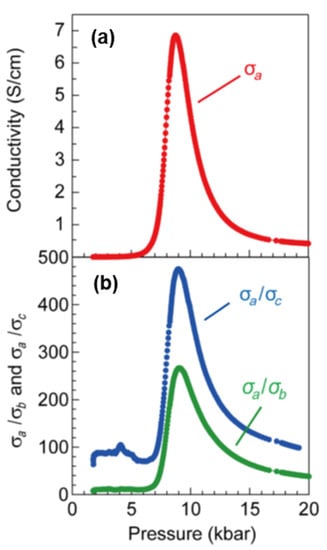 Pressure profiles of electrical conductivity along the a-axis σa (a) and the anisotropies of conductivity, σa/σb and σa/σc (b), at ambient temperature. Reprinted with permission from []. Copyright 2019, The Authors, some rights reserved; exclusive licensee AAAS. Distributed under a CC BY-NC 4.0 License (http://creativecommons.org/licenses/by-nc/4.0/ (accessed on 15 November 2021)).