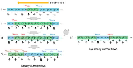 Why are spin solitons required for a steady electrical current? We briefly explain the transport mechanism by topological excitations using the schematic illustrations depicted in Figure 14, where the N and I states are represented as D0A0 and D+A−, respectively, for simplicity.