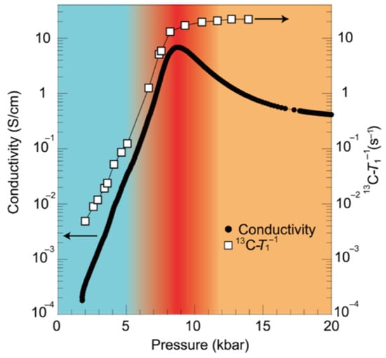 Pressure profiles of the electrical conductivity (closed circles) and 13C-NMR spin–lattice relaxation rate 13T1−1 (open squares) at ambient temperature. The blue-, red-, and orange-colored regions roughly indicate the neutral phase, NI crossover region, and ionic phase, respectively. Reprinted with permission from []. Copyright 2019, The Authors, some rights reserved; exclusive licensee AAAS. Distributed under a CC BY-NC 4.0 License (http://creativecommons.org/licenses/by-nc/4.0/ (accessed on 15 November 2021)).