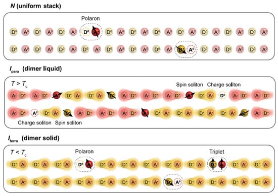 Next, we discuss the difference between the decreases in the spin shift and 13T1−1 below Tc. For conventional singlet–triplet excitations, the temperature profiles of S and T1−1 in the spin-singlet phase should not significantly differ []. Thus, the observed behaviors of S and T1−1 imply the presence of at least two types of spin excitations below Tc. In the Iferro phase, soliton excitations should be in pairs so as not to violate the 3D ferroelectric order (see Figure 16); one is the triplet spin soliton pair excitation of charge-neutral spin 1, and the other is the spin soliton–charge soliton pair excitation, equivalently polarons, with a charge e and a spin 1/2, as discussed for conducting polymers []. The polarons carry not only spins but also charges without violating the ferroelectric dimer order in the Iferro phase. As estimated above, the spin soliton density nss is larger than the charge soliton density ncs in the Ipara phase above Tc, suggesting that the magnetism just below Tc should be dominated by bound spin soliton pairs, whose triplet excitations cause a steep decrease in the spin shift. On the other hand, well below Tc, where triplet excitations with a large gap of 3240 K almost vanish, the polaron contribution is expected to be dominant in 13T1−1. These pictures signify that the Ipara-to-Iferro phase transition is a binding transition of solitons upon the symmetry-breaking dimer order.