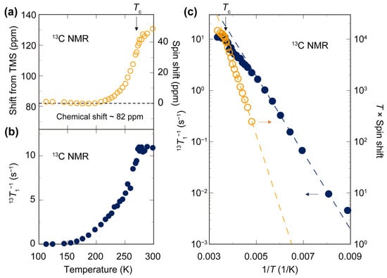 Temperature dependence of 13C-NMR spectral shift (a) and spin–lattice relaxation rate 13T1−1 (b) at 14 kbar. (c) Activation plots of spin shift multiplied by temperature (orange open circles) and 13T1−1 (blue closed circles). Reprinted with permission from []. Copyright 2021, American Physical Society.
