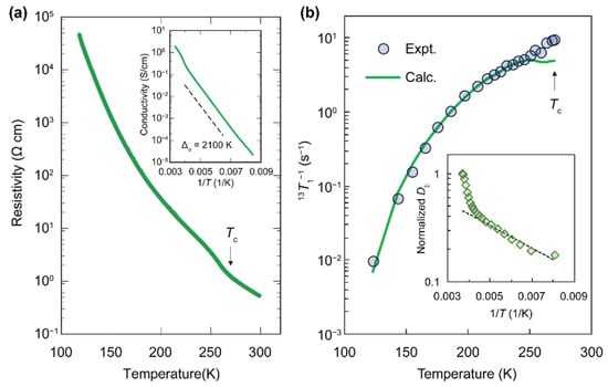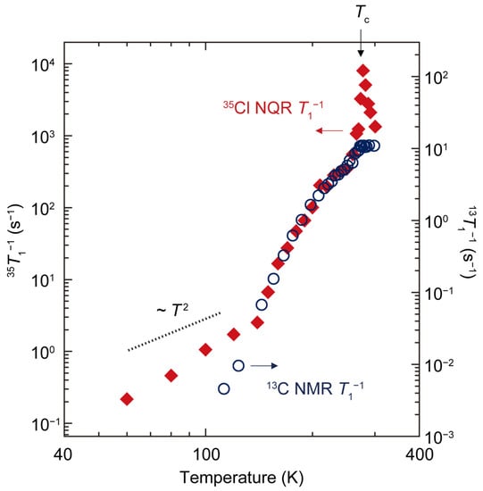 To seek further evidence for the emergence of polarons, we investigated the lattice properties using 35Cl-NQR spectroscopy. The motion of polarons should be followed by lattice distortion. Thus, the 35Cl-NQR spin–lattice relaxation rate 35T1−1, probing the lattice fluctuations through nuclear quadrupolar interaction, gives valuable insights into the lattice dynamics. 35T1−1 exhibits a divergent peak at Tc, which is attributable to the critical lattice fluctuations associated with the 3D ferroelectric dimerization transition, and becomes suppressed upon cooling (see Figure 18). Below 140 K, 35T1−1 roughly obeys the T2 law, which is the conventional phonon contribution by the two-phonon Raman process []. Above 140 K, however, 35T1−1 is drastically enhanced from the T2 law, indicating that another relaxation mechanism appears. Remarkably, it is scaled to 13T1−1 for 140 < T < 250 K (< Tc), signifying that the quadrupolar and magnetic relaxations are attributed to common excitations. This strongly indicates that the spin carriers causing the magnetic relaxation below 250 K are not conventional band quasiparticles but polarons dragging lattice distortion.