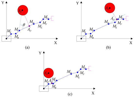 As can be seen from Figure 3, the projection of obstacles’ center can be on the connecting rod, on the right extension line, or on the left extension line. Where, represents a joint or the corner of a joint.