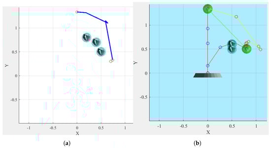 In Figure 6 and Figure 9, the blue transparent circles represent obstacles. The two red circles represent the start and end positions of the end effector. The green circle represents the position of the target point. The blue line represents the planned obstacle avoidance trajectory. It is obvious that the obstacle avoidance trajectory obtained by the proposed method based on IPSO is shorter than that obtained by the method based on PSO, which shows that the proposed method using IPSO is more effective.