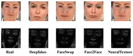 The pixel values of the preprocessed face image are calculated from the adjacent pixel values of the original image. In the smooth area of the image, the difference between these pixel values is small, so the pixel value of the smooth area tends to be zero after preprocessing method. In high-texture areas, the difference between these pixel values is large, and the high texture area would still be retained after preprocessing. Therefore, after preprocessing module, the texture information can be largely preserved. As shown in Figure 3, the first row displays the normal and corresponding forged face images, and the images in the second row are the image processed by the preprocessing method.