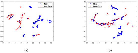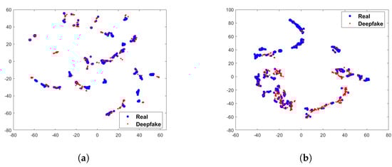 Illustration of t-SNE visualization of statistical variance value without the preprocessing module on FF++ and Celeb-DF. (a) 2-D visualization on FF++ dataset; (b) 2-D visualization on Celeb-DF dataset.