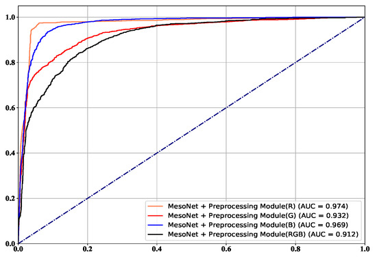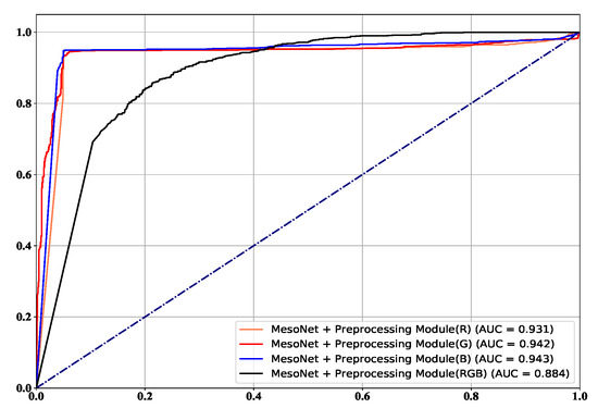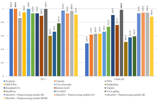 The frame level comparison results are listed in Figure 8. It is worth noting that the Xception is tested with their pre-trained model, and the FWA and DSP-FWA are only trained on the FF++ dataset. On the FF++ dataset, the performance of the proposed method rivals that of the state-of-the-art detectors based on deep learning. In addition, the performance of the proposed method is superior to detection methods based on hand-crafted features. Our proposed detection method based on MesoNet with preprocessing module achieves the best ACC and AUC of 0.941 and 0.974 on the FF++ dataset. Figure 9 and Figure 10 show ROC in the frame level. Most of the current detection methods can achieve good results in the FF++ dataset. The main reason is that many defects appear in the FF++ dataset. With these artifacts, good detection performances can be obtained. For example, Capsule [30] mainly focuses on the position of facial features in the image. Due to the poor quality generated in the FF++ dataset, the facial features of the target characters in some videos are not coordinated. Hence, this method can achieve excellent performance. In the new generation dataset represented by Celeb-DF, the performance of our proposed method is better than the most current state-of-the-art methods. The highest AUC of our proposed method can reach 0.943, and the lowest AUC is 0.884. In addition, Robust-GAN [34] incorporates the attention mechanism into the improved Xception network and fuses the feature information of RGB and YCbCr color channels to achieve detection. It can reach 0.759 on the Celeb-DF dataset. Detection methods based on hand-crafted features like HeadPose, VA-MLP, and VA-LogReg rely on specific tampering traces, such as uncoordinated head poses and uncoordinated head poses. Such defects are corrected in the new generation of deepfake videos, so these three methods are less effective in the new dataset.