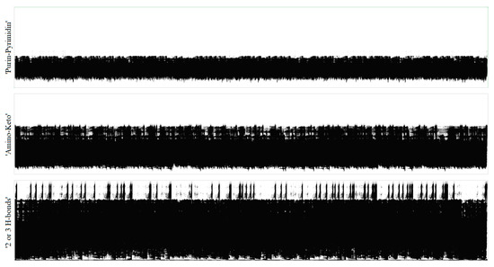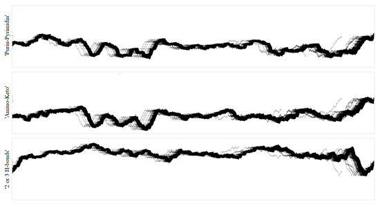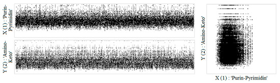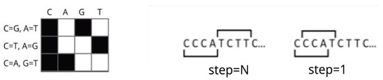 We can depict three binary sub-alphabets in the form of a matrix, shown in Figure 1. It is possible to divide the nucleotide sequence into equal parts in various ways: with overlap (step = 1) and without overlap (step = N). For the best quality and resolution of visualizations, we used step = 1. With this approach, the number of points in visualizations becomes N times larger, which allows for obtaining more accurate results.