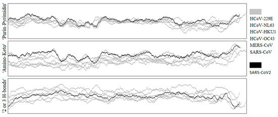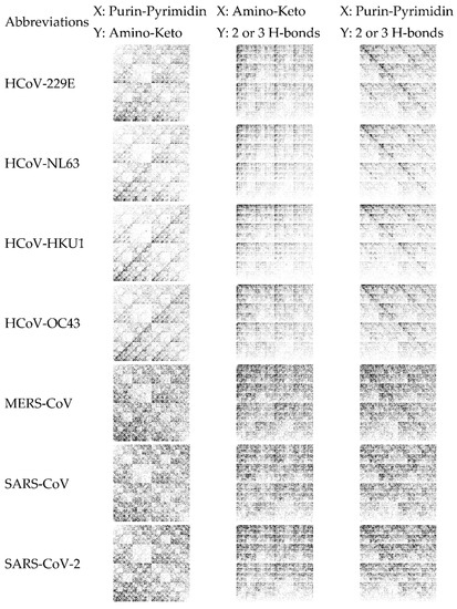 Imaging did not involve any genetic sequence manipulation (alignment, etc.). In Figure 7, each of the three plots corresponding to a set of nitrogenous bases with three forms of binary oppositional features shows all the instances represented in the dataset. In Figure 7, we can see that despite the absence of any preparatory steps before genometric imaging, all coronavirus specimens presented in the dataset possess a similar structure in all (three) types of boolean properties. Figure 8 shows the result of frequency imaging of the same dataset. Accordingly, we can conclude that this type of visualization has a considerable overlap of results. Here, we compare the SARS-CoV-2 with other familiar strains.