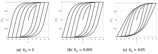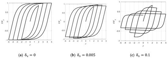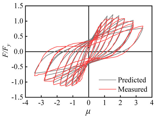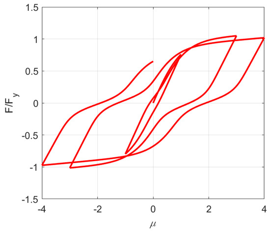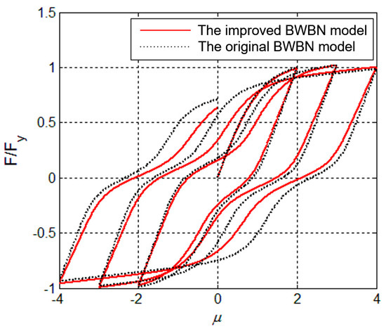 - According to the typical hysteretic characteristics of the object, the appropriate basic parameters were selected and taken into the hysteretic model for NDTHA. Based on the work by Ma et al. [37], the basic parameters in the improved BWBN model were , , and , as shown in Figure 10.