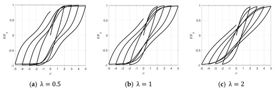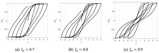 where p, q, ζs, λ, ψ, and δψ are all the parameters determining the pinching effect, which are explained in detail in the literature [28]. Specifically, ζ1 sets the pinching severity, and ζ2 sets the region where the pinching will spread. The influences of the key parameters ζs and λ are shown in Figure 3 and Figure 4. The decrease in loading and unloading stiffness in a certain region above and below the x-axis results in the whole cure pinching inward in the middle, which is the so-called pinching effect. The pinching phenomenon becomes more obvious as ζs increases. When λ equals 0.5, 1.0, or 2.0, the pinching region in the y-axis is [−0.3, 0.3], [−0.4, 0.4], or [−0.6, 0.6], respectively, indicating that the pinching scope increases as λ increases.
