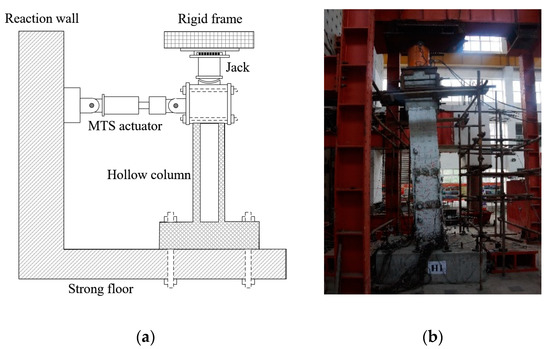 Fourteen rectangular RC hollow columns, including seven square hollow columns, were tested under low-cycle reversed loading. The geometry of the cross-section is shown in Figure 5. The exterior dimensions were 800 mm × 500 mm (500 mm × 500 mm), and the web thickness was 120 mm. The design parameters are summarized in Table 1. The control variables included the section shape (rectangular and square), aspect ratio (h/b1 = 4–8), longitudinal rebar ratio (ρ0 = 1.63–2.69%), and volumetric stirrup ratio (ρv = 1.26–3.04%). All specimens were casted in C40 concrete (fc = 40 MPa) with HRB 400 longitudinal rebar (fy = 400 MPa) and HRB335 stirrup (fys = 335 MPa). According to engineering practice, the axial load ratios ηa of hollow bridge columns are usually approximately 5%; thus, all the specimens were loaded with a constant axial compression ratio of 5%. A schematic diagram of the loading system is shown in Figure 6. Vertical compression was applied using a jack with a spherical hinge and roller shaft to ensure the rotation and translation of the column tip. Horizontal lateral reversed loading was applied using an MTS hydraulic actuator.