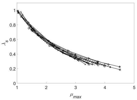 where and are the secant stiffness of the positive and negative loading directions in the loading cycle, respectively, and and are the corresponding secant stiffness levels at the equivalent yield points, respectively. The stiffness degradation index λs of each specimen measured in the quasi-static test above is shown in Figure 7. The peak displacement ductility coefficient μMax is defined as the ratio of the maximum inelastic displacement at each loading level to the equivalent yield displacement. As observed, there is a significant correlation between the stiffness degradation index of the column and its peak ductility coefficient. When the RC member reaches a new peak displacement, its overall stiffness decreases significantly.