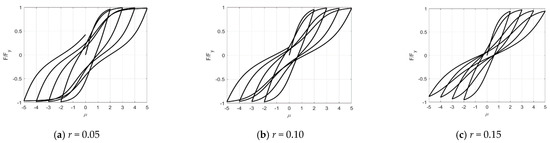 The influence of the peak displacement coefficient r (0.05, 0.10, and 0.15) on the shape of the hysteretic loops is shown in Figure 9. As observed, a larger r implies more obvious degradation of unloading stiffness as peak displacement increases and less residual displacement after unloading.