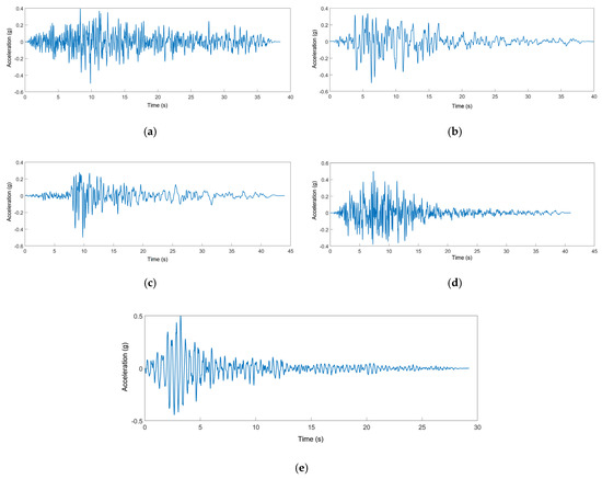 The time history curves of scaled ground motion records. (a) Ground motion E1, (b) Ground motion E2, (c) Ground motion E3, (d) Ground motion E4, (e) Ground motion E5.