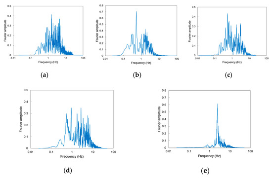 The frequency spectra of scaled ground motion records. (a) Ground motion E1, (b) Ground motion E2, (c) Ground motion E3, (d) Ground motion E4, (e) Ground motion E5.