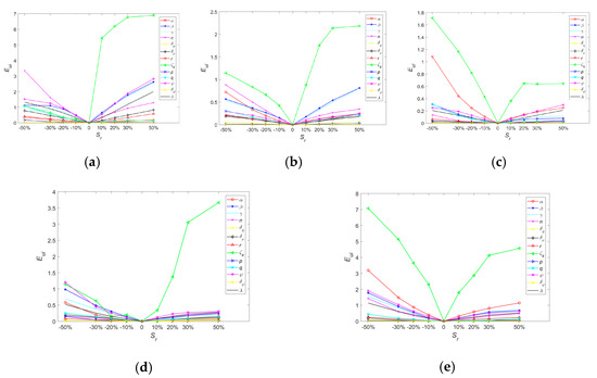Five ground motion records were used for local sensitivity analysis, and the error function Eui of each parameter is shown in Figure 13. When subjected to the same record, the ranking of Eui at the same Sr indicates the sensitivity of the parameters to the improved BWBN model. The error function Eui increases with increasing Sr, but the sensitivity ranking remains unchanged for most parameters. For the calculation results of different ground motion records, the sensitivity ranking of each parameter is slightly different, but the overall rankings are approximately the same.
