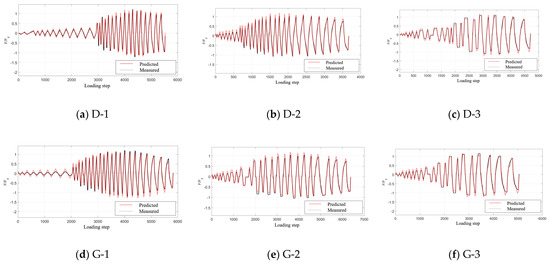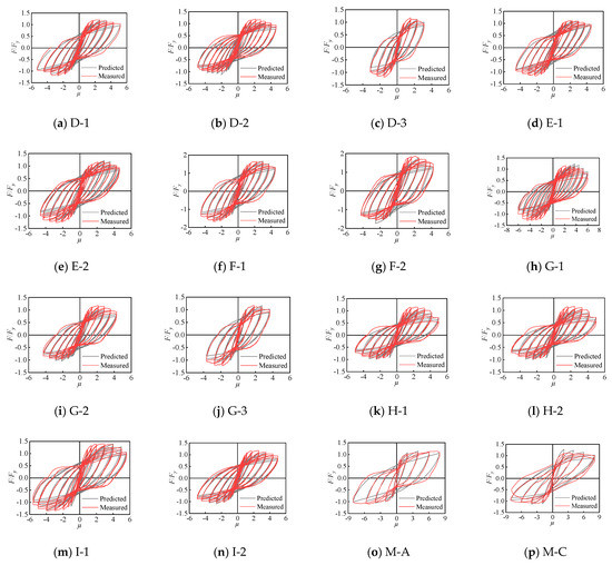 Since the axial load is the significant parameter influencing the shape of a hysteretic curve, two specimens by Mander et al. [42] were added as members of the hollow column database. The design parameters of the two supplied columns are listed in Table 5, the main distinction being axial values of 0.1 and 0.3. To ensure the generality of the parameter identification, the measured hysteretic curve was normalized by the yield displacement and yield force in the x-axis and y-axis, respectively. The identified parameters of the improved BWBN model for these sixteen hollow specimens are presented in Table 6, along with the range of each parameter, as shown in Table 7. The predicted and experimental hysteretic curves of sixteen hollow columns are shown in Figure 15. As seen, the hysteretic model with the parameters identified by PSOGSA can fully describe the restoring force characteristics of the specimen. The phenomena of strength and stiffness degradation and the pinching effect are clearly displayed. Furthermore, the fitness function set in the parameter identification process contains all the data for the whole loading process. The loading history of the tested and identified restoring forces of six hollow columns with different aspect ratios are shown in Figure 16. It is clear that the loading steps of the improved BWBN hysteretic model almost coincide with the measured data.