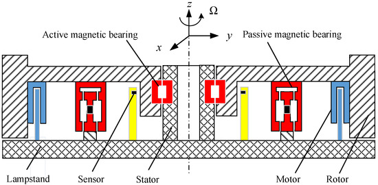 The flywheel studied in this paper is a five degrees-of-freedom suspension. The structure of the magnetically suspended flywheel is shown in Figure 1. On the two radial degrees of freedom, the translation control of the rotor is realized by active magnetic bearings. On the other three degrees of freedom, the stability of the rotor is realized by using the magnetic resistance between the stator and the rotor of the passive magnetic bearing. The main focus of this study was the active vibration control of two degrees of radial freedom [9].