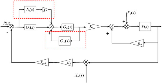 Figure 2 shows the block diagram of the x-direction, in which is the proportional–integral–derivative controller of the original system, is the power amplifier, is the transfer function of the rotor system, and R(s) is the reference signal. and are, respectively, the coefficient of the sampling and displacement sensors.