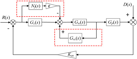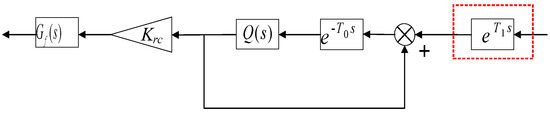 Here, is the repetitive controller, and its detailed control block diagram is shown in Figure 5. Furthermore, is a medium- and low-frequency phase compensator, is the gain of the repetitive controller, and is the low-pass filter. This will satisfy when , is the cutoff frequency, and it can also be taken as a constant of less than 1. In addition, is the time delay link [24].