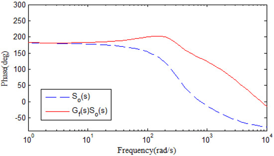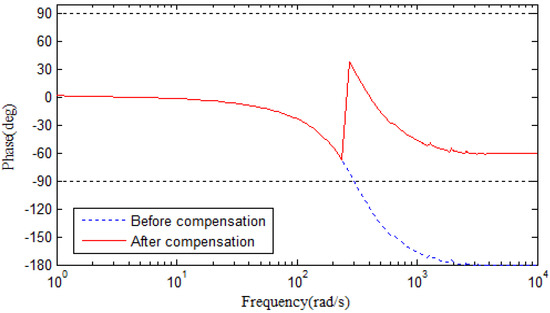 The phase diagram of drawn according to the parameters is shown in Figure 6. It is known that the stability condition in (12) cannot be satisfied without compensation, and phase compensation is required in the middle- and high-frequency stages. The phase compensation is carried out by introducing .