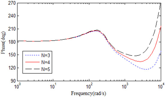 The sample period Ts = 0.0001 s. The phase diagram of is drawn with different N, as shown in Figure 7. When N = 4, it can be obtained that with cutoff frequency . The system meets the stability condition with the bigger phase margin than others. To facilitate the design, the low-pass filter was selected as 0.98.