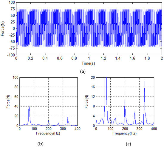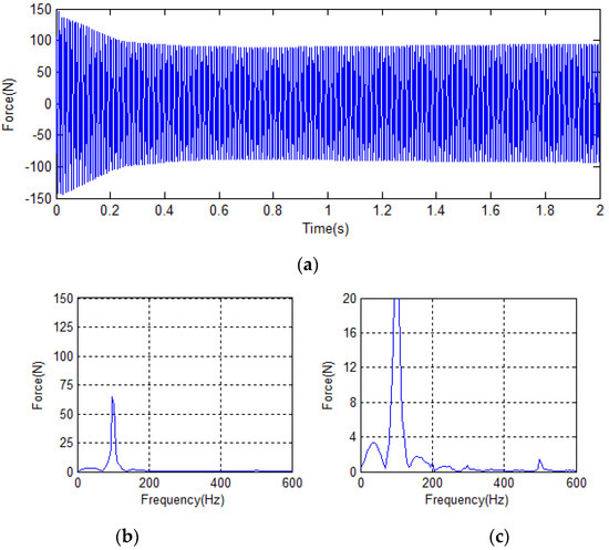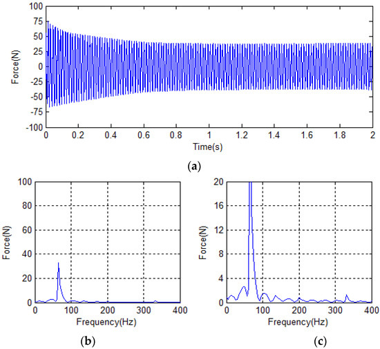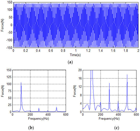 The time domain diagram of the vibration force after the repetitive controller suppression is shown in Figure 11a. The vibration amplitude was reduced, the same frequency force was reduced to 32.7 N, and the two-times frequency vibration force was reduced from 4.7 to 1.5 N. The amplitudes of the three-, four-, and five-times frequency reduced from 9.5, 4.2, and 18.1 N to 0.6, 0.4, and 1.3 N, respectively. The frequency-doubling vibration force was effectively suppressed after the addition of the repetitive controller. At this time, the content of the vibration force was mainly the same frequency vibration force, the same frequency force produced by current was suppressed, but the displacement vibration force still exists, so it was important to compensate for the same frequency displacement vibration force.