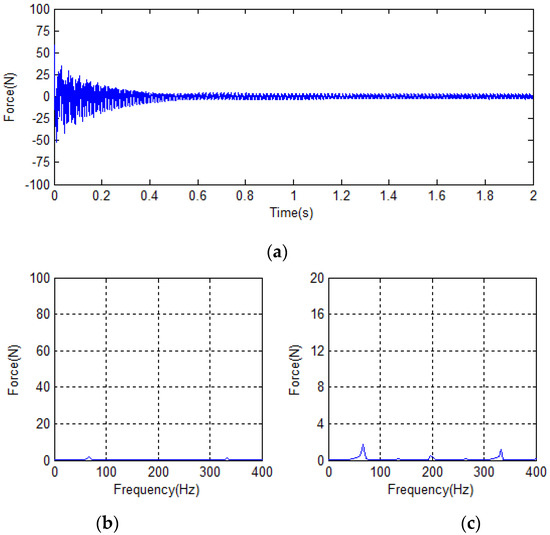 The time domain diagram of the vibration force after the suppression of the compound control method is shown in Figure 12a. The amplitude of the vibration force was greatly reduced to 3.1 N at 0.6 s, and the amplitude of the same frequency was obviously reduced to 1.8 N, as shown in Figure 12c. At the same time, the amplitudes of two-, three-, four-, and five-times frequencies reduced to 0.1, 0.4, 0.2, and 1.1 N, respectively.