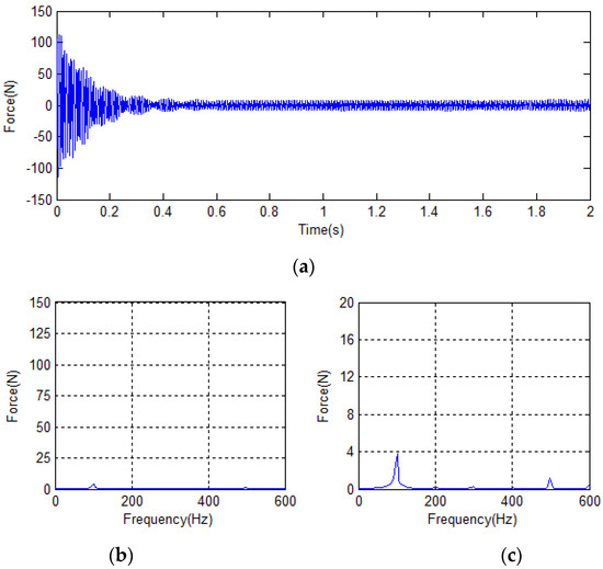 The time domain and frequency spectrum analysis when the rotational speed is 628 rad/s is shown in Figure 13. The same frequency vibration force caused by the mass imbalance is proportional to the square of the speed. Its amplitude increases rapidly to 102 N, and the frequency doubling quantity increases accordingly with the increase in speed. At this time, the vibration force of the five-times frequency increases to 18.5 N. The time domain and frequency spectrum analysis after adding the repetitive controller is shown in Figure 14, and the same frequency vibration force is reduced to 64.6 N (approximately 36.7%). The three-, four-, and five-times frequency vibration forces are reduced to 0.7, 0.3, and 1.1 N, respectively. This also shows the effectiveness of the repetitive controller in suppressing the electromagnetic force generated by each frequency-doubling current. The stability after 0.6 s of compound repetitive control is shown in Figure 15. The spectrum analysis shown in Figure 15c demonstrates that the vibration force of the same frequency is rapidly reduced to 3.8 N, and the amplitudes of other frequencies are also slightly reduced. After adding the compound suppression method, the amplitude of the vibration force is suppressed from 140.1 to approximately 7.3 N, and the suppression result is approximately 94.8% that of the unsuppressed method. This verifies the effectiveness of the method.