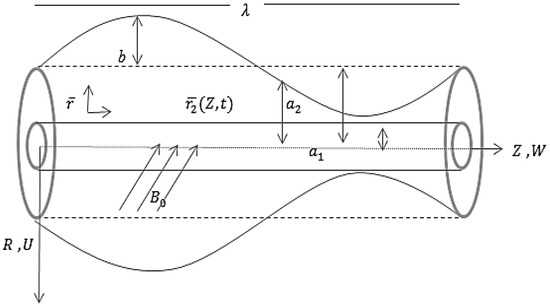 where a is the average radius of the undisturbed tube, b is the amplitude of the peristaltic wave, is the wavelength, c is the wave propagation speed, and is time. In the fixed coordinates (, ) the flow between the two tubes is unsteady. It becomes steady in a wave frame (r, z) moving with the same speed as the wave in the Z-direction. The transformations between the two frames is: