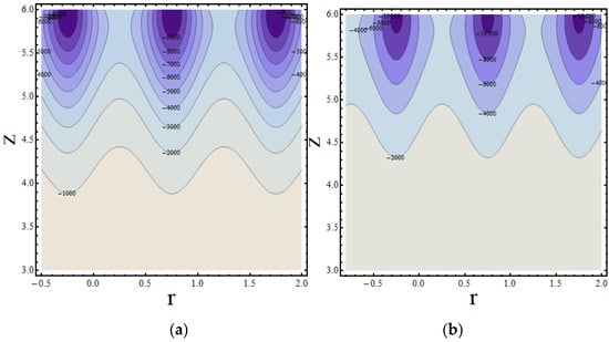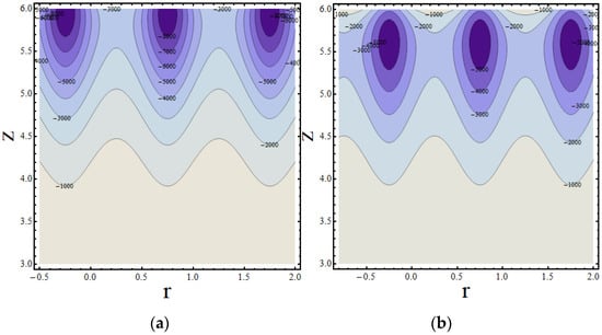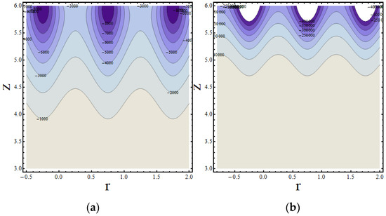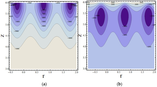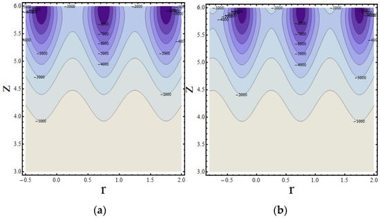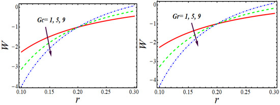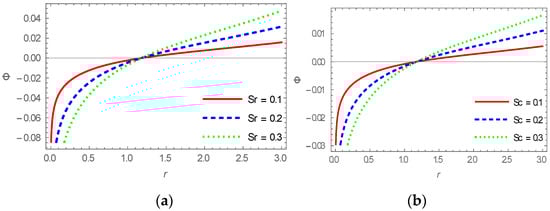 Figure 2 shows the effects of the parameters Sc and Sr on the concentration profile . It was observed that decreases with the increase on Sr with in the range from 0 to 1.37622, beyond which, it increased with the increase of Sr. The curves of were obtained for = 0.1, 0.2, and 0.3 when the other parameters were constant. Figure 2b shows the effect of on the concentration distribution, and it is clear that decreased as increased, and also affected the relation between and r. This relation appeared approximately inverse for small values of Sc, but, for large values of Sc, increased with increasing, till a finite value of r (minimum value), after which it decreased. These phenomena are due to the fact that the solute diffusion in fluids is always proportional to the diffusion coefficient. Therefore, a decrease in the concentration is due to a decrease of the diffusion coefficient. The same behavior was shown for in Figure 2b. It can be explained by Equation (22), since both parameter are inversely proportional to the concentration. As a consequence for it recuses for higher values of Sr and Sc.