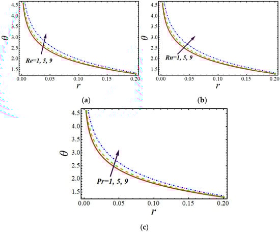The variation of the temperature vs. r, at . (a) Pr = 2, Rn = 2 (b) Re = 0.1, Pr = 2, (c) Re = 0.1, Rn = 2.