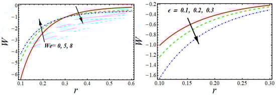The effect of Grashof number is illustrated in Figure 4. It was observed that the fluid velocity decreased with the increase of , and started to increase when . It is seen that with the increase of the velocity declined, but became larger for . Figure 5 shows the variation of the velocity with for various values of the Weissenberg number . This figure shows that the fluid velocity increased with the increase of the Weissenberg number in the range of [0.1–0.32], whereas the opposite was observed in the range of [0.32–0.60]. To examine a viscoelastic flow, the Weissenberg number was used. We inspected the effect of forces from elastic to viscous. For high values of the Weissenberg number, the flow of fluid particles encountered resistance, and as a consequence, the velocity decreased. In Figure 5 we see that decreased with the increase of . Figure 6 illustrates the velocity profile for various values of the magnetic and Darcy parameters. We concluded that the velocity decreased for increasing values of the magnetic field parameter . The reason for this phenomenon is that, due to the increase in magnetic the parameters, the Lorentz force was generated and created a resistance force in the flow; as a result, the velocity profile decreased. Further, this figure shows that the velocity decreased by increasing M in the range of ad after that, the velocity increased by increasing M. It is also clear that, in all curves in this figure, the maximum value of occurred at . In Figure 6, the effect of on the velocity distribution is displayed. It is clear that increased by increasing in the range of , and decreased by increasing in the range of . In this figure, we can also see that, although there was a big difference between the values of , we observed small differences between the three curves of which were taken at , when the other parameters were constant.