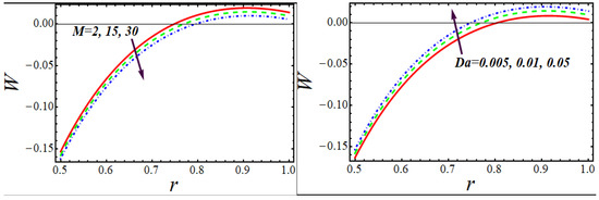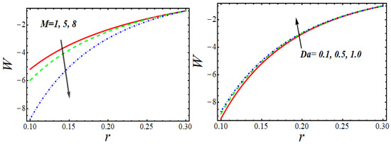 The presented mathematical model was developed for non-Newtonian Williamson fluids and can be reduced to non-Newtonian fluids as . In that case, we used the same model and mathematical equation previously described [30,31] for non-Newtonian fluids. For this purpose, the velocity profile for different values of magnetic parameter and Darcy number is presented in Figure 12. It can be seen from this comparison graph that the velocity decreased as M increased in the range of . The effect of on velocity distribution was similar. It is clear that w decreased as increased in the range of , and w decreased as increased. Both results are similar to those obtained by Shabaan [30].
