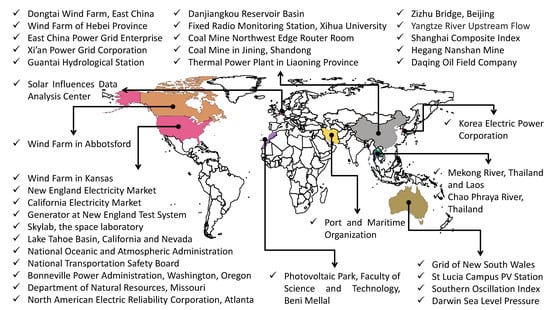 According to the literature review collected from Table 1, 43% of works have employed the ANN-based approaches in the literature for chaotic time series forecasting. The additional techniques are based on the following: FNN 24%, optimization algorithms 15%, WNN 6%, and other approaches 4%. In the 15% of optimization-algorithm-based techniques, the various algorithms used are GA, PSO, SSA, SA, SOM, CGO, GWO, CBAS, etc. The objective of these techniques is to improve accuracy, computational efficiency, and concerns due to the presence of uncertainties in various applications. Some novel techniques reported in Table 1 focused on efficiently tackling multiple objectives. Table 1 also shows that these articles have dealt with several forecasting parameters, such as load, power, speed, traffic flow, signals, etc. In some of these works, real-time data were also collected from various countries, including Australia, Belgium, Canada, China, Iran, Laos, Morocco, Thailand, and the USA, as shown in Figure 2. In the first decade, research on chaotic time series forecasting relied on statistical data to forecast the system’s future behavior. The rest of the decades used artificial intelligence and other novel models for chaotic time series forecasting in various applications. The detailed analysis of various forecasting approaches in different applications is explained in the following sections.