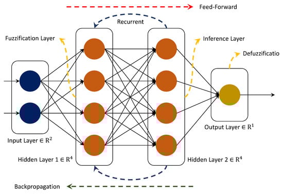 FNN is a hybrid network developed using ANN’s learning ability and fuzzy logic’s noise handling capability. The architecture of the FNN is also shown in Figure 4. The figure shows that the network has four layers: the input layer, fuzzification layer, inference layer, and defuzzification layer (refer to the yellow dotted lines in Figure 4). FNN uses two approaches, namely (i) Mamdani and (ii) Takagi and Sugeno. Fuzzy logic is represented using the neural network’s structure and trained using either a BP or an optimization algorithm. The FNN is implemented in the following three ways: