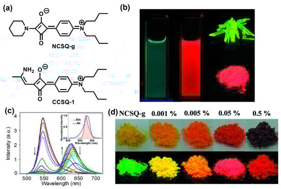 Unsymmetrical SQs have constituted a large portion of SQ-based fluorescent materials. This is because compared to the symmetrical structure, unsymmetrical SQs exhibit much better flexibility for synthetic manipulation, making their absorption and emission properties easily tunable by modifying the end-groups []. More importantly, symmetry breaking can to some degree weaken the strong intermolecular interactions between SQs. For example, Gao et al. developed two piperidine-capped unsymmetrical SQs, i.e., NCSQ-g and CCSQ-1, as shown in Figure 2a []. NCSQ-g was found to show unconventional solid-state fluorescence (photo-luminescence quantum yield, ΦPLQY = 0.36), while CCSQ-1 only had intense fluorescence in solution, associated with a typical ACQ effect in the solid state (Figure 2b). Interestingly, as shown in Figure 2c, the emission spectrum of the NCSQ-g powders exhibited an almost complete overlap with the absorption band of CCSQ-1 in solution, enabling an efficient energy transfer from NCSQ-g powder to CCSQ-1. When a very small amount (0.0001–1.0 mol%) of CCSQ-1 was doped into NCSQ-g, the characteristic emission peak of NCSQ-g at 548 nm gradually decreased, while the emission of CCSQ-1 appeared and gradually increased with increasing amounts of CCSQ-1. As a result, various fluorescence colors from yellow-green to scarlet was obtained, as shown in Figure 2d, by doping a small amount of CCSQ-1 powder into NCSQ-g (0–0.5 mol%).