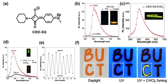 On the basis of the work of NCSQ-g, Gu and Peng et al. recently reported another piperidine-capped unsymmetrical SQ named CIEE-SQ, produced by changing the length of the alkyl chain of aniline end group (Figure 3a) []. CIEE-SQ exhibited no emission in diluted THF solution, but strong yellow emission in crystal (Figure 3b), suggesting crystallization-induced emission reverses from dark states to bright excited states. Meanwhile, the CIEE-SQ-CHCl3 co-crystal (Figure 3c) was obtained in CHCl3 solution with the yellow-green emission. Moreover, as shown in Figure 3d, the study demonstrated that when the filter paper strip immobilized with CIEE-SQ was put into the vessel with the saturated CHCl3 vapor, intense yellow-green emission was observed under 365 nm UV lamp, reverting to a weak orange-yellow emission after removal from vessel. This phenomenon can be repeated many times without apparent fatigue (Figure 3e). On this basis, a simple encryption model was established; the strong yellow-green emission of the character of “C” encrypted by CIEE-SQ was only illuminated by CHCl3 fuming under UV irradiation while other characters showed no emission (Figure 3f).