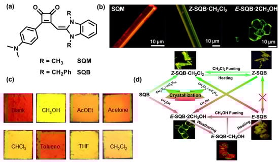 In contrast to the commonly explored 1,3-substituted unsymmetrical SQs, 1,2- substituted unsymmetrical SQs exhibit more distorted molecular structure, but greater fluorescent emission properties. Wang et al. reported two novel 1,2-unsymmetrical SQs, namely SQM and SQB (Figure 4a), using benzimidazole derivatives modified with methyl and benzyl groups as the end groups, respectively []. Therein, the benzimidazole derivatives provided a torsion angle with respect to the central squarate ring to suppress the intense π–π stacking. As is depicted in Figure 4b, the single crystals of SQM and SQB were obtained from different solvents with strong bright yellow to red fluorescence. In crystal, the SQM molecules self-assembled into 1D microrods, whereas 1D microrods (Z-SQB·CH2Cl2) or 2D microplates (E-SQB·2CH3OH) were found for the SQB assemblies. In Figure 4c, upon subjecting the red-emitting E-SQB·CH3OH crystalline to various solvent vapors, quite distinct emission colors can be identified. Moreover, the multiple vapochromism of the SQB·solvent assemblies were demonstrated in Figure 4d, indicating that crystalline SQB can be used as a potential fluorescent sensor for the detection of different organic solvent vapors.