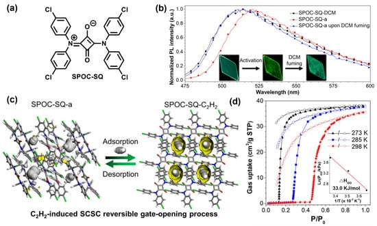 Recently, symmetrical SQs have also been successfully designed to achieve CIEE properties. For example, Gu et al. synthesized a symmetrical SQ based on bis(4-chlorophenyl)amine end group (SPOC-SQ), which can form emission-tunable, purely organic, soft porous crystals (Figure 5a) []. The formation of porous crystal framework is promoted by intermolecular interactions, including π-π interactions and H-bonds. SPOC-SQ performed weak emission in solution state, but efficient green emission in single crystal state, thus exhibiting CIEE properties. Interestingly, these crystals were found to exhibit reversible stimuli-responsive single-crystal-to-single-crystal (SCSC) structural transformation, accompanied by tunable emission (Figure 5b). Moreover, the activated SPOC-SQ-a can selectively absorb acetylene (C2H2) over other gases without destroying the single crystallinity (Figure 5c), with a gate-opening sorption enthalpy of 33.0 kJ/mol (Figure 5d).