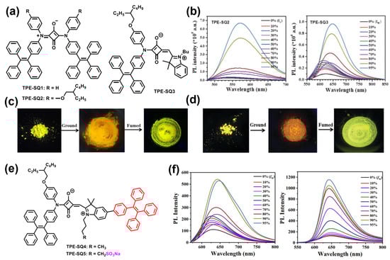 (a) Molecular structures of TPE-SQ1-3. (b) Fluorescent spectra of TPE-SQ2-3 in THF/H2O mixtures with different water volume fractions. Mechanochromism fluorescence photographs of pristine, ground, and fumed TPE-SQ1 (c) and TPE-SQ2 (d) powders and under UV lamp illumination. Adapted with permission from Ref. []. Copyright 2020, Royal Society of Chemistry. (e) Molecular structures of TPE-SQ4 and TPE-SQ5. (f) Fluorescent spectra of TPE-SQ4 (left) in THF/H2O mixtures with different water volume fractions and TPE-SQ5 (right) in THF/n-hexane mixtures with different n-hexane volume fractions. Reprinted with permission from Ref. []. Copyright 2021, Wiley-VCH.