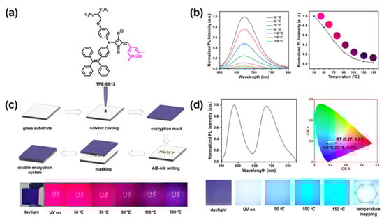 Furthermore, we developed another SQ-based AIE luminogen (AIEgen) with deep-red emission based on pyrylium end group, namely TPE-SQ12 (Figure 7a) []. We found that the use of elastomer as the host polymer can significantly improve the thermoresponsive performance of AIEgens, and thus by doping a small amount of TPE-SQ12 into styrene-butadiene rubber (SBR), we obtained a high-performance, red-emissive, thermoresponsive film with high contrast ratio, fast response time (less than 3 s), and excellent reversible response (Figure 7b). Using this SBR/TPE-SQ12 film, double encryption for anti-counterfeiting and temperature mapping systems were successfully established (Figure 7c). Moreover, white emission was further realized by co-doping TPE-SQ12 with a cyan dye into SBR under UV irradiation (Figure 7d), delivering fluorescent thermochromism with enhanced temperature mapping ability.