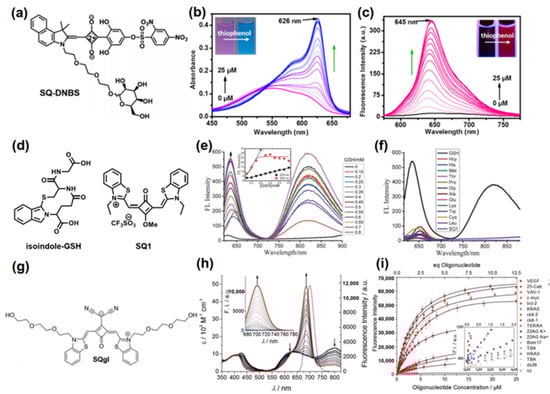 (a) Molecular structure of SQ-DNBS. (b) Absorption spectra of SQ-DNBS with the addition of different concentrations of thiophenol in PBS. (c) Fluorescent spectra of SQ-DNBS with the addition of different concentrations of thiophenol in PBS. Reprinted with permission from Ref. []. Copyright 2017, American Chemical Society. (d) Molecular structures of SQ1 and isoindole-GSH. (e) Fluorescent spectra of SQ1 with the addition of different concentrations of GSH in borate buffer. (f) Fluorescent spectra of SQ1 in the presence of OPA, 11 different kinds of amino acids and Hcy. Adapted with permission from Ref. []. Copyright 2013, Royal Society of Chemistry. (g) Molecular structure of SQgl. (h) Absorption (solid lines) and fluorescent (dotted lines, inset) spectra of SQgl with the addition of different concentrations of VAV-1 in buffer solution. (i) Fluorescent titrations curves of SQgl buffered solution with the oligonucleotides showing in the legend. Adapted with permission from Ref. []. Copyright 2017, Wiley-VCH.
