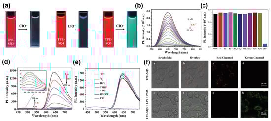 As discussed in above, our group has developed a series of SQ-based deep-red-emissive AIEgens, i.e., TPE-SQ3-5 (Figure 6) []. We further encouragingly found that they could serve as high performance ClO− sensors with high selectivity and sensitivity (Figure 9a–e). The results showed that TPE-SQ3 and TPE-SQ4 are “turn-off” fluorescent probes (Figure 9b), while TPE-SQ5 is a ratiometric fluorescent probe (detection limit: 5.6 nM) (Figure 9d). The sensing mechanism indicated that when detecting ClO−, an oxindole product is generated for TPE-SQ5 (the key for ratiometric fluorescence), while an epoxide product is obtained for TPE-SQ4. In addition, TPE-SQ5 can be fabricated into nanoparticles (NPs) with biocompatible nonionic Pluronic F-127. The resulting TPE-SQ5 NPs exhibited excellent biocompatibility and low cytotoxicity, and can sensitively image exogenous and endogenous ClO− in living cells (Figure 9f).